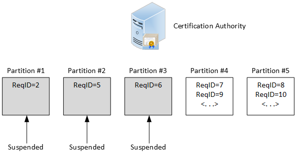 In some cases, you may want to temporarily freeze some partitions by suspending them. CA will not assign any CSR to suspended partition and will use only active partitions. You cannot suspend arbitrary partition, instead, you can suspend a number of partitions at the beginning. For example: