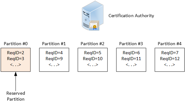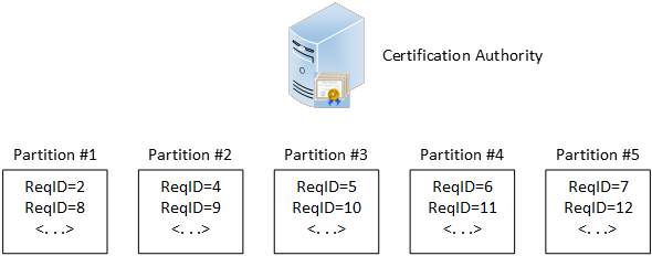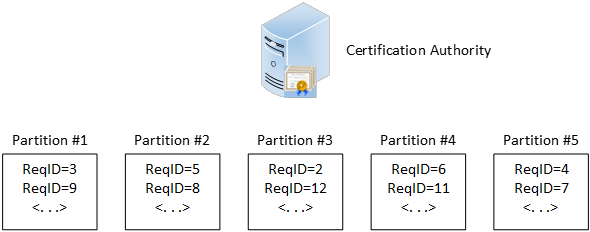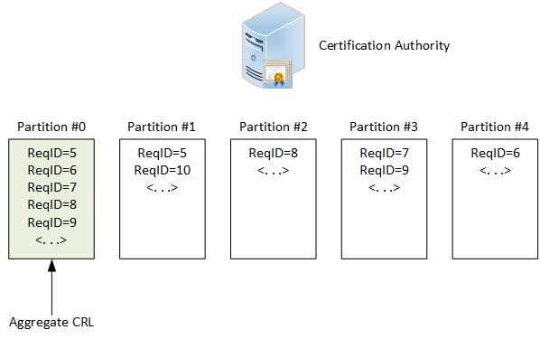 In this figure, we see: a request with ID = 5 is assigned to partition #5, ID = 6 is assigned to partition #1, ID = 7 to partition #2 and so on. CA automatically assigns request (and potentially issued certificate) to some partition on CSR submission event. Once assigned, certificate binding to partition cannot be changed. Then, when certificate is revoked, it is included in assigned partition, which is known in advance. If you have a custom policy module, you can clearly see bound CRL partition prior to issuing CA. Alternatively, you can see partition index when request is pending.